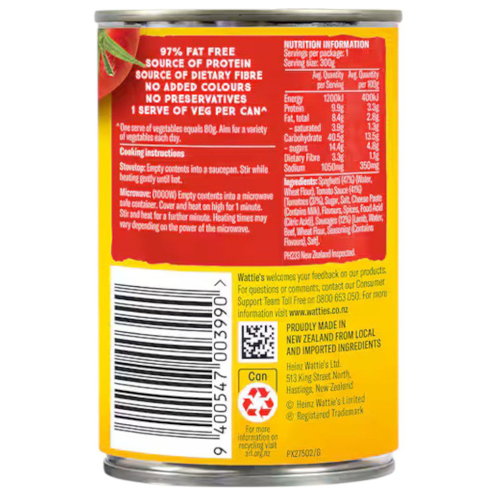 Detailed nutritional information label for a 300g can of Wattie’s Spaghetti with Sausages, including ingredients and serving suggestions.
